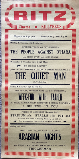 Killybegs folklore had it that these men had planned to erect a cinema on the site, but due to the shortage of materials during the War, the project did not proceed.  In the meantime, Joe McBrearty, father of Claire Tully and Conor McBrearty, fitted out a cinema in a building on his property fronting on to Chapel Lane, and the Ritz Cinema came into existence.