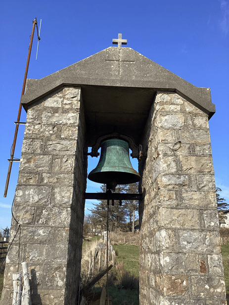St Matthew’s Church of Ireland church in Kilcar has been long abandoned and roofless. The landlord, Murray Stewart, through his agent, G. V. Wilson in the White House, Killybegs, provided “a stove, a bell, and £18 towards the purchase of a harmonium” for this church prior to 1875. However, details of the bell’s manufacture, purchase, and erection have not yet been found.