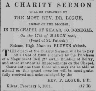 On the day appointed, 17th March 1882, High Mass was celebrated in the old church by the Rev Francis B. Gallagher. His Lordship, the Most Rev Michael Logue, Bishop of Raphoe, was present, and preached a charity sermon, the purpose of which was to inspire the congregation to contribute to the costs incurred. The congregation was ‘large’ and included ‘not a few strangers from other parishes’. The music of the mass, taken from Webbe and Bordese, was ‘rendered effectually by the choir under the direction of Miss Martin who presided at the harmonium’. It was reported that ‘upwards of £170’ was collected within the church. In a list of contributors published later, it could be seen that the Killybegs contributions amounted to £16 12s 0d. while those of Kilcar totalled £12 16s 0d. This was no doubt offset by the contributions of those who attended the mass, who would have consisted of mainly Kilcar parishioners. A list of contributors was published in the press, these consisting of the more affluent citizens of the district. It might be said that many locals in the congregation likely paid more than some of the sums published, and it may also be remarked that a humble farmer or fisherman’s shilling was a greater contribution than some of the figures published?