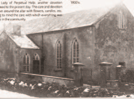 In 1904 when the present church was completed the 1882 bell was erected high on a hillside overlooking the town. It was said that “the bell was blessed so that as far as it could be heard nobody would be killed by lightning”. The task of transporting the bell from the old church to the high ground was entrusted to Hugh Chestnutt of Derrylahan. As the direct route to the new tower was too steep, Hugh had to take his horse and cart carrying the bell by the main road, and out along ‘the line’ turning left down to its destination.