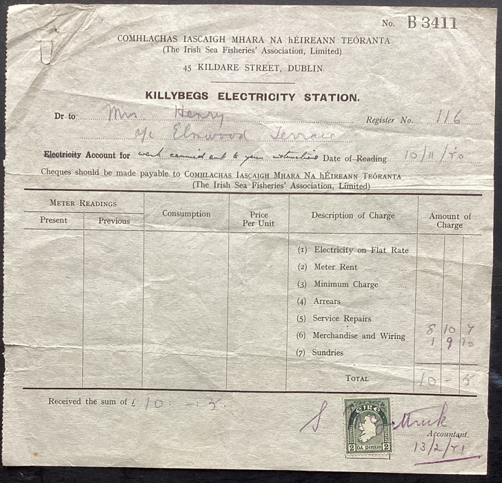 A receipt for £10 0s 5d for work carried out to your instructions from the ISFA, KILLYBEGS ELECTRICTY STATION, to Emma Henry, dated November 1950.