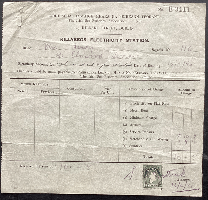Electric Light. Before the Electricity Supply Board came along the town electricity was provided by the Electricity Station at the local Boatyard. The Boatyard and generating plant were owned by the Irish Sea Fisheries Association (ISFA). Emma Henry had her house No. 4 wired for electricity in 1950. Local contractors were hired to wire the houses for the new AC current of the ESB. The ESB did not have a high opinion of the people of Killybegs and Kilcar. They posted notices advising householders that: Houses that are not wired cannot be supplied with electricity (!).